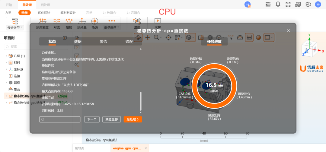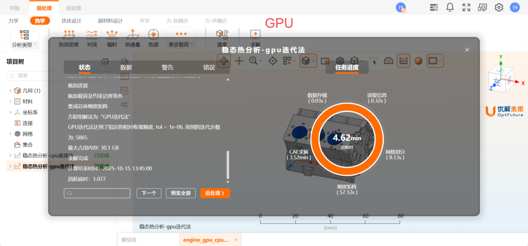 在私有化部署版本中,我们支持利用NVIDIA GPU进行加速计算。相对于CPU直接法,GPU计算可节省大量内存;相对于CPU迭代法,GPU计算可显著提升计算效率。对于工程实际中的大型模型的仿真和优化,利用GPU进行加速求解可节省大量的计算时间,且无需配备大内存。
