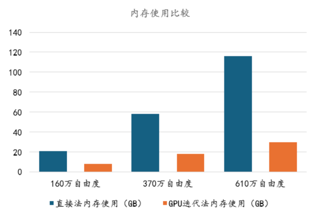 2. 内存大幅节省:610万自由度场景下,GPU迭代法内存开销仅30GB,较直接法(116GB)节省72%,普通工作站即可胜任;